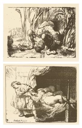Zwei ältere Herren betrachten lüstern eine schlafende, leichtbekleidete Schönheit
