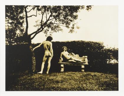 Gleichsam als Ausschnitt gestaltetes Relief mit dem Akt einer Frau, die einen Apfel hält