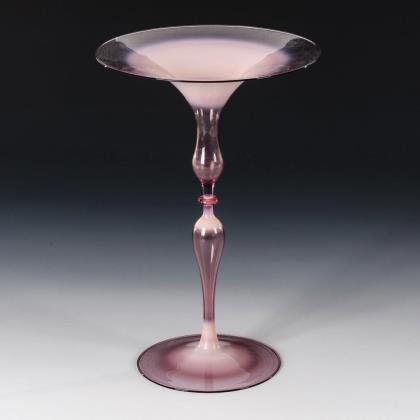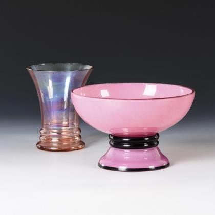 1x längsoptisch geblasener Becher aus rosafarbenem, irisiertem Glas, um 1905 (H 12 cm). / 1x Fußschale aus farblosem Glas mit rosafarbenem Opalglasinnenfang und schwarzen Emailstreifen, um 1925 (H 10 cm, Ø 16,5 cm)