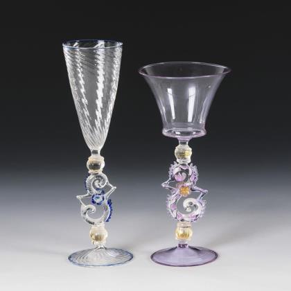 1x schrägoptisch geblasener Sektkelch aus farblosem und blauem Glas mit s-förmigem Schaft mit zwei angeschmolzenen Blüten. / 1x Kelchglas aus transparent-violettem Glas mit s-förmigem Schaft und zwei aufgeschmolzenen Blüten