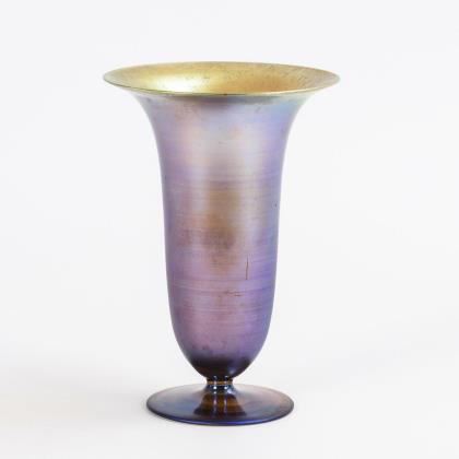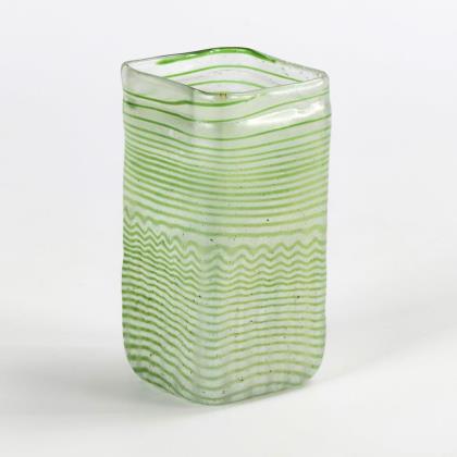 Dreiseitig-konische Vase mit ausgestelltem, gekniffenem Stand, ausgekugelter Abriss. Umlaufend geätztes Dekor: Wilder Wein und Linienbordüre am Stand