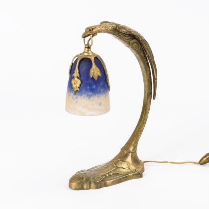 Glockenschirm (H 12 cm), eingehängt in einen gebogten Lampenarm in Form eines Greifvogels, geometrisch reliefierter Fuß. Elektrifiziert (Funktion nicht geprüft)