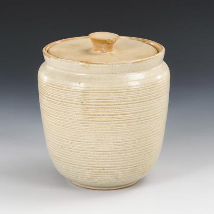 Leicht konische Zylinderform mit feingerillter Wandung, flacher Deckel mit Knauf