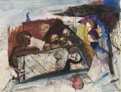 "SCHNEEWITTCHEN war ein Beitrag von Prof. Claus Weidensdorfer zu der deutsch-deutschen Hommage an Ludwig Emil Grimm, dem Malerbruder von Jacob und Wilhelm Grimm. Beteiligt waren 30 Künstler aus der DDR und der Bundesrepublik. Ihre Werke wurden aus Anlass des 200. Geburtstages von Ludwig Emil Grimm in der Ausstellung "Künstler sehen den Künstler Ludwig Emil Grimm" in den Jahren 1989/90 in zahlreichen ost- und westdeutschen Städten gezeigt. Mit dem Weidensdorfer-Werk wurde auf Plakaten an den verschiedenen Ausstellungsorten geworben. Es ist im Katalog auf Seite 21 abgebildet." (Information der Galerie 88 in Hanau)