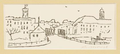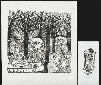 "Froschkönig", [19]70, Stock: 28 x 30 cm, Blatt: 40 x 36 cm und kleinformatiger Holzschnitt, Blatt: 20 x 10 cm als Beigabe in einem Faltblatt anlässlich einer Ausstellung des Erfurter Kunstkabinetts vom 15.4.1973 bis 26.5.1973