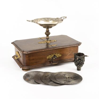 Kleine "Spieluhr" mit Ratschenaufzug und Zughebel in der Front sowie leerer Kartusche auf dem Deckel. Im Deckel Farblithografie "Polyphon" mit Schriftzug. Gemarktes Werk mit Zungenkamm (9 cm). Lochplatten mit Zentralantrieb (Ø 20,7 cm) z.B. "Österreichische Nationalhymne", "Marseillaise", "Zigeuner-Baron", "Champagner-Galopp" usw