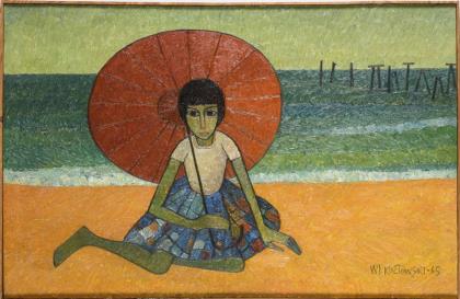 Naiv gemalte junge Frau mit Sonnenschirm am Strand