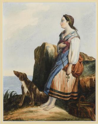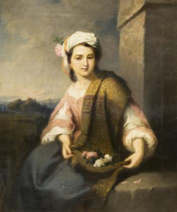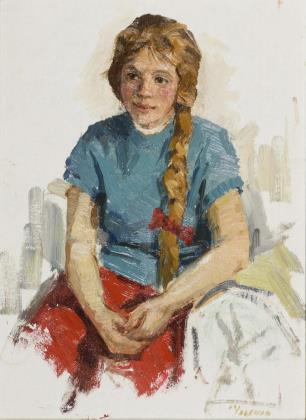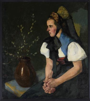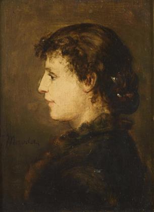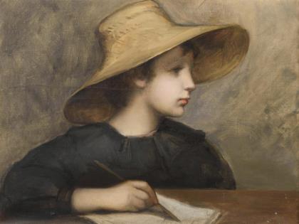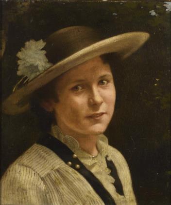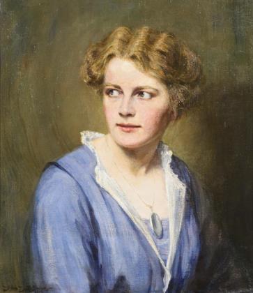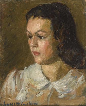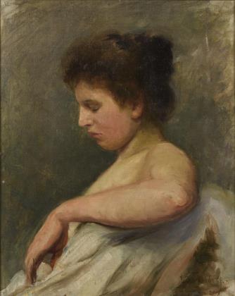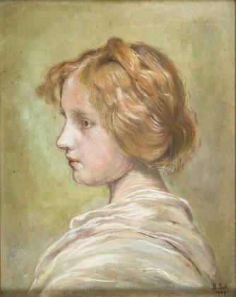 Profilbildnis einer jungen Frau mit blondem Haar und weißer Bekleidung