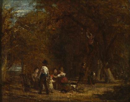 Die kulissenhafte Landschaftsauffassung mit räumlicher Tiefe und reicher Figurenstaffage ist in gleichmäßiger Tiefe aufgebaut. Vergoldeter Stuckrahmen