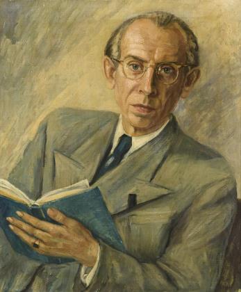 Porträt eines älteren Mannes mit Brille in grauem Anzug mit einem Buch