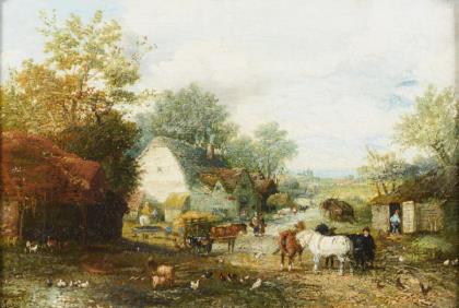 Reges Treiben auf der Straße vor den Häusern mit den Pferdewagen und dem Vieh