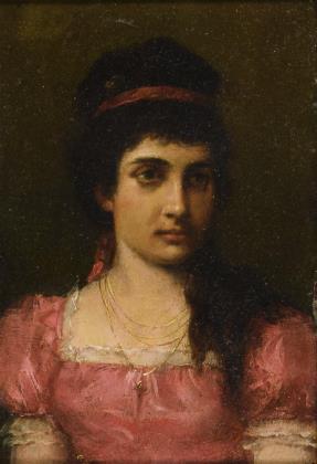 Porträt der Helenita Oehlecker im fliederfarbenen Kleid mit Medaillonkette