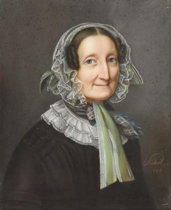 Porträt einer älteren Dame im schwarzen Kleid mit Spitzenhaube