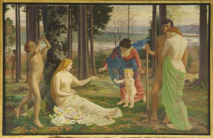 Sitzender weiblicher Akt am Ufer des Isartals mit einem Korb voller Blumen, daneben ein Paar mit Kleinkind und ein nackter, Flöte spielender Knabe