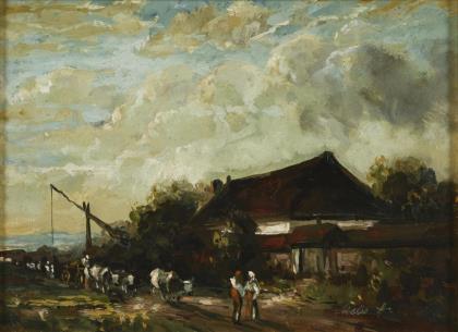 Dorfstraße mit Bauern und dem Vieh nahe dem Brunnen