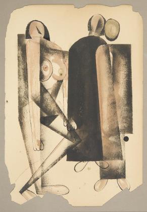 Auf eine strenge Struktur in Braun- und Grautönen reduziert. Die dargestellten Figuren sind in geometrische Teile zergliedert. Verglaster profilierter Goldrahmen