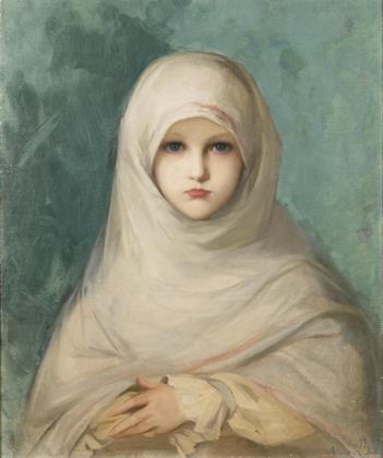 Frontales Bildnis einer jungen Frau mit weißem Kopftuch vor blauem Hintergrund