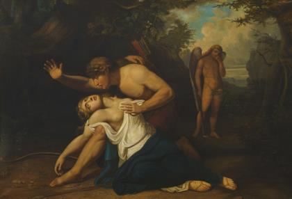 Sehr gute Kopie nach dem Original, das heute in Venedig zu sehen ist, mit dem erschrockenen Kephalos, der erkennen muss, dass er seine Frau Prokris, welche sich im Gebüsch verbarg, erschossen hatte, weil er sie für ein Wildtier hielt. Im Hintergrund eine geflügelte Gestalt mit gesenkter Fackel, dem Zeichen des Todes