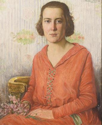Qualitätvolles Porträt einer jungen Frau im roten Kleid mit Fliederstrauß