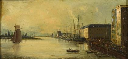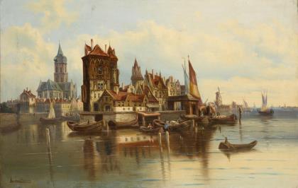 Staffagefiguren in den Booten und am Fluss im Sonnenschein am Rand der Stadt