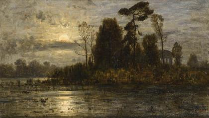Vollmond über der kleinen Insel mit dem Rundbau und der schemenhaft erkennbaren Figur