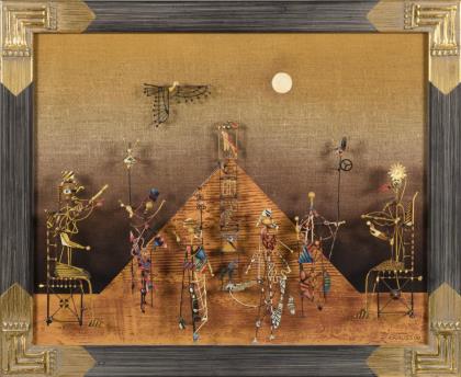 Mehrere Figuren bei Vollmond nahe der Pyramide
