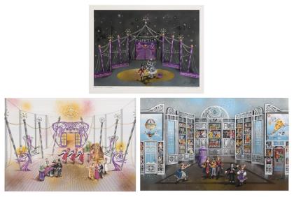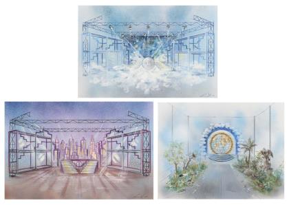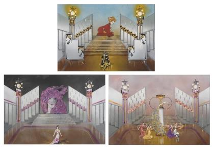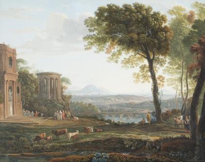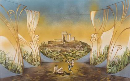 Die Figuren in antikisierendem Bühnenbild vor Wolkenhimmel