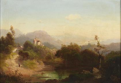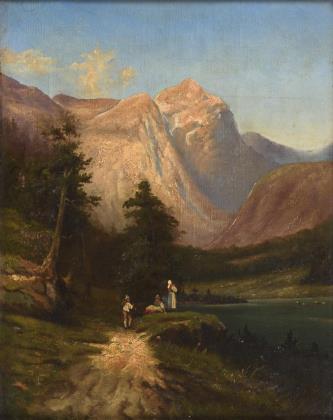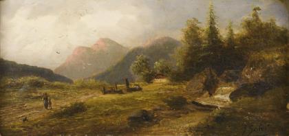 Brunnen mit Bauernkate und Staffage im Gebirge