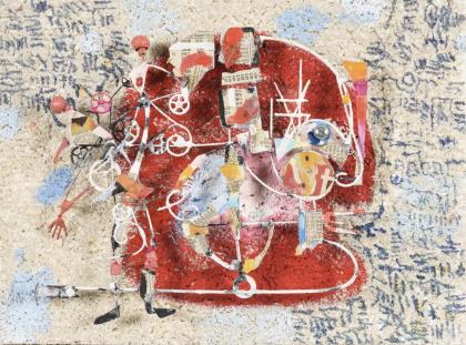 Surrealistische Genreszene mit Kosmonaut und Hündin im Himmel sowie einer Familie, welche beiden zuwinkt