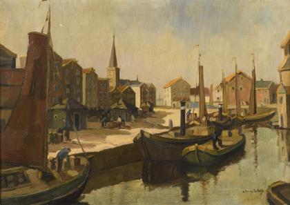 Fischer in den Booten nahe den Häusern der Stadt. Anbei holländische Expertise von 1991