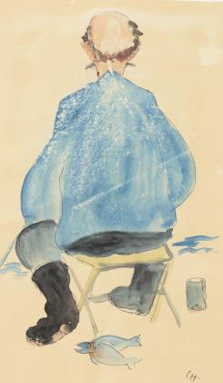 Rückenbildnis eines Mannes am Fluss mit den Fischen unter dem Stuhl