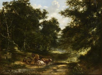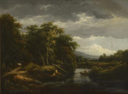 Vieh am Waldrand nahe dem Flussufer mit dem Kahnfahrer