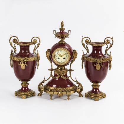 Tailliertes Gehäuse mit Vasenbekrönung, seitlich gehörnten Maskaronen und reichem Applikationsschmuck. Dazu ein passendes Vasenpaar
