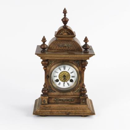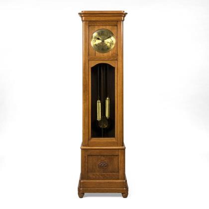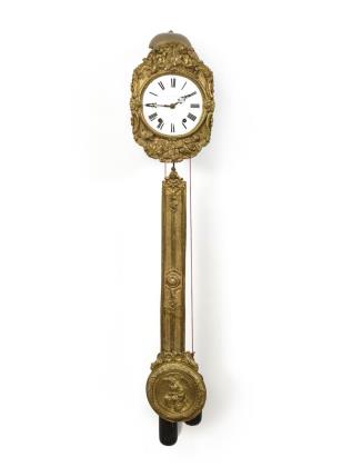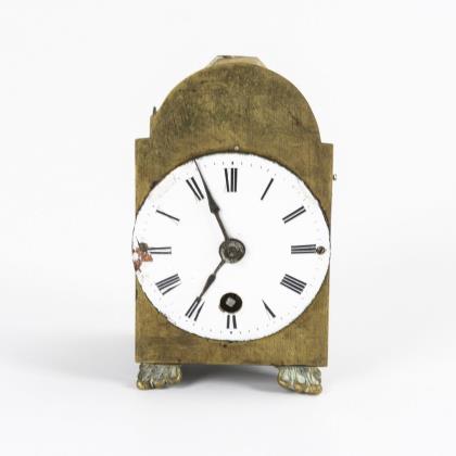 Messingräderwerk mit Halbstundenschlag auf Eisenglocke, Funktion nicht geprüft, Werk läuft laut Einlieferer. Weißes Emailzifferblatt mit römischen Zahlen, Minutenkranz und geschnittenen Zeigern, bezeichnet "BAZUREL à St. Trivier-de-Courtes". Rundbogengehäuse, kassettiert und floral beschnitzt