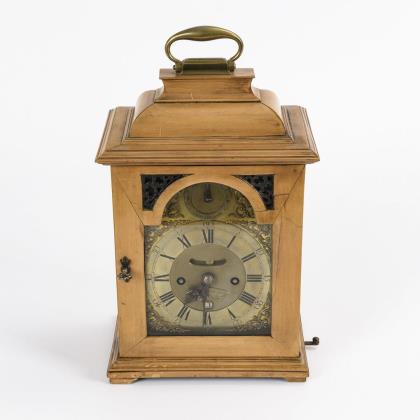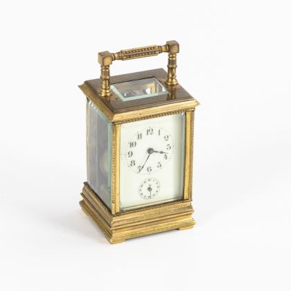 4-seitig verglastes Gehäuse mit Rundbogenfeldern und gewalmtem Dach mit Messing-Tragebügel