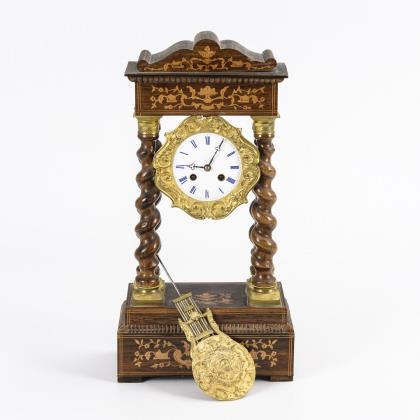 Stufensockel mit 4 gedrehten Säulen, aufgehängtem Uhrwerk mit großer Relieflünette und geschweiftem Giebel