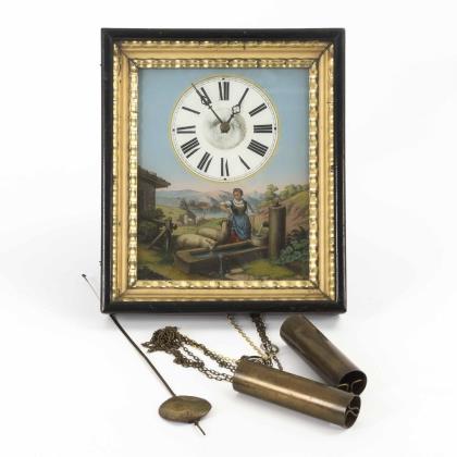 Farbiges Hinterglasbild mit Landschaft und bäuerlicher Genreszene, im oberen Bildbereich ein weißes Zifferblatt mit römischen Zahlen, Minutenkranz und vierpassigen Zeigern