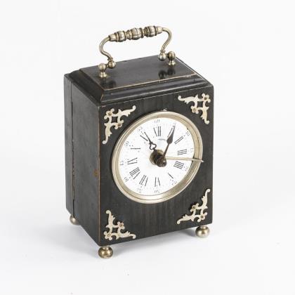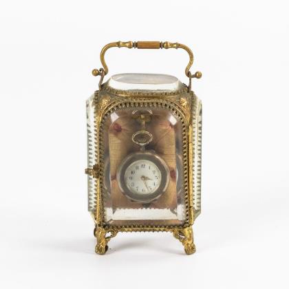5-seitig verglastes Gehäuse, innen ein seidenbezogenes Polsterkissen mit Haken zur Uhrenauflage, profilierter Tragebügel. Dazu eine silberne Damentaschenuhr um 1900, Galonné-Gehäuse mit floralen Gravuren und Wappenreserve, 800/Halbmond/Krone gepunzt, Firmenmarke "P&M", Zylinderhemmung, Kronenaufzug, läuft