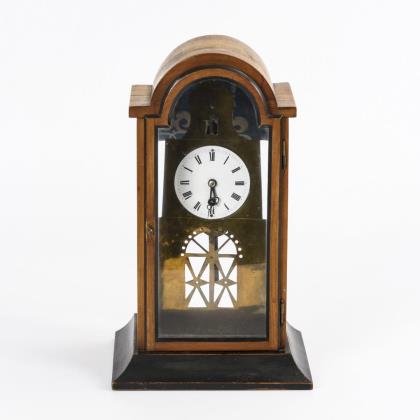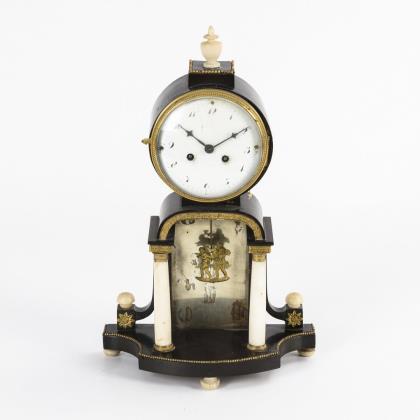 Architektonisches Gehäuse mit Satteldach und Schildbogenfront, seitlich kleine Glasfenster und Pendelöffnungen, auf 4 Akanthusblattfüßen