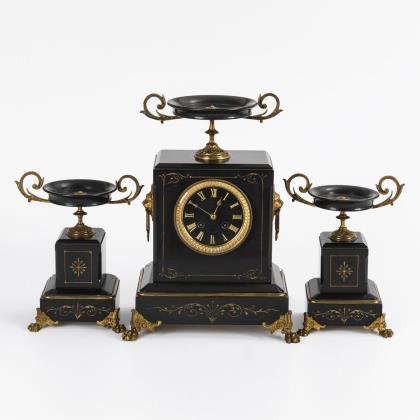 Rechteckige Stele mit Schalenbekrönung und seitlichen Löwenmaskaronen mit Ringhandhaben, auf leicht vorkragendem Sockel mit Tatzenfüßen. Dazu 2 passende Beisteller