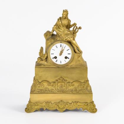 Hoher Stufenreliefsockel mit bekrönendem Uhrwerk und männlicher plastischer Figur mit Lyra, Lorbeerkranz und Schriftrolle (wohl allegorische Darstellung des Orpheus oder Apollon)