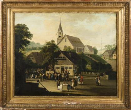 Süddeutsche Dorfansicht (wohl Bayern) mit feiernden Männern und Frauen, am Kirchturm der "Zachäus", die rot-weiße Kirchweihfahne, sowie eine Kirchturmuhr mit aufgemaltem Zifferblatt, Zeiger fehlen