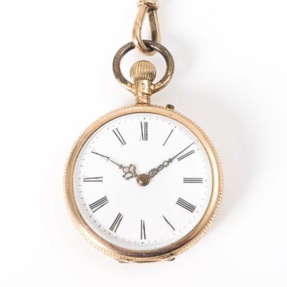Ziseliertes Gehäuse mit schwarz emailliertem Früchtemotiv. Vergoldete Gliederkette mit Karabiner, großem Federring und zweiseitigem Medaillonanhänger, L 26,5 cm