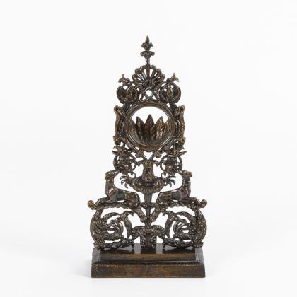 Fein durchbrochener und beidseitig vollplastisch gefertigter Ständer mit 2 Windhunden und Vögeln, Blatt- und Muschelwerk, auf flachem Rechtecksockel mit Zungenfries
