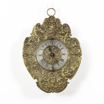 Rundbogengehäuse mit verkröpftem Profilsockel, seitliche Drechselsäulen und Zapfenzier, bekrönender Aufsatz fehlt. Floral gravierte Front