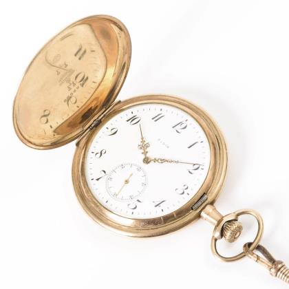 Sprungdeckelgehäuse mit gestuftem Rand und Streifendekor, leere Ovalreserve. An vergoldeter Uhrenkette mit 2 Karabinern, L 55,5 cm