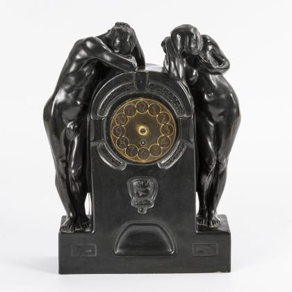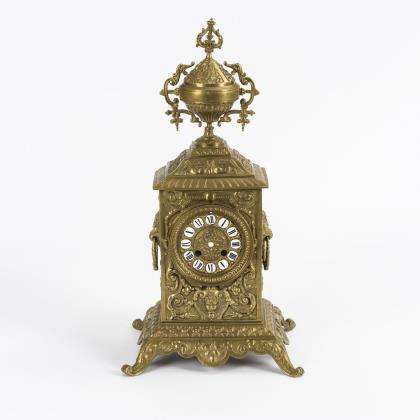 Reliefuhrengehäuse in Stelenform, mit Vasenbekrönung, gerolltem Blattdekor und seitlichen Löwenmaskaronen mit Ringhandhaben. Weiße Emailkartuschen mit römischen Ziffern
