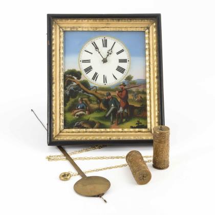 Farbiges Hinterglasbild mit Landschaft und Jägern bei der Rast, im oberen Bildbereich ein weißes Zifferblatt mit römischen Zahlen, Minutenkranz und vierpassigen Zeigern