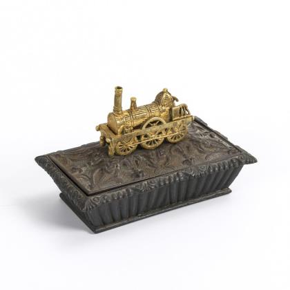 Tumbaförmige Dose mit Reliefornament sowie montierte Lokomotive auf dem Passdeckel. Reibefläche im Deckel