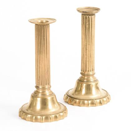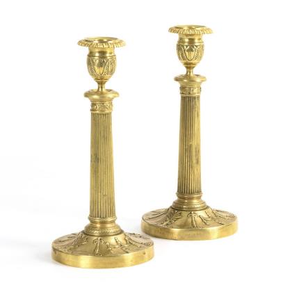 Massive Louis-Seize-Bronzeleuchter mit kanneliertem Säulenschaft auf hohem Fuß